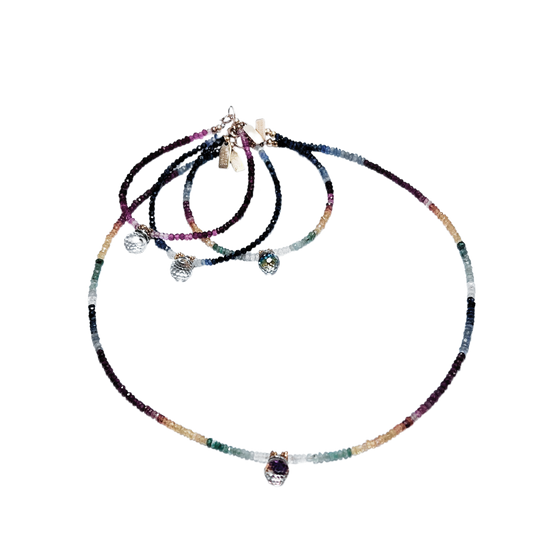 Rainbow collection: precious blue & yellow sapphire, ruby, emerald necklace with rainbow globe