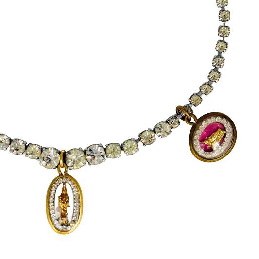 Vintage medium Round-Stone Diamanté Necklace with Gold Buddha Talismans