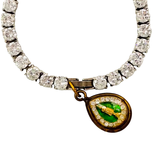 Vintage 1950s Diamanté Single-Row Bracelet with Green Buddha Talisman