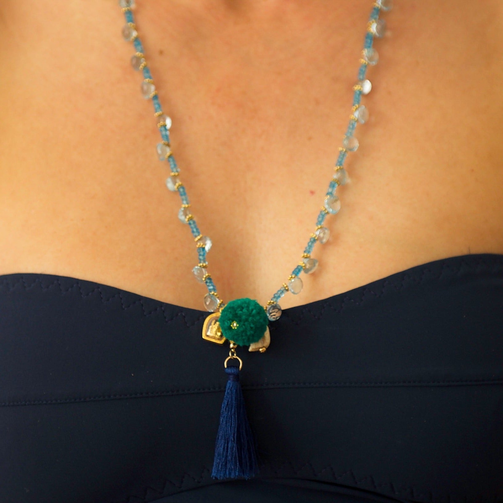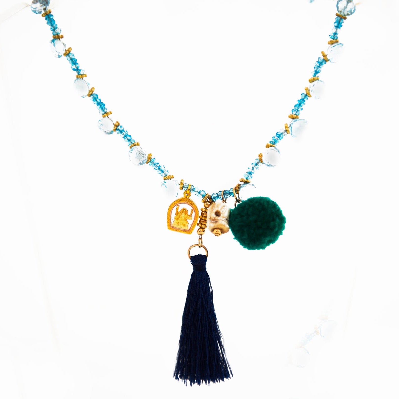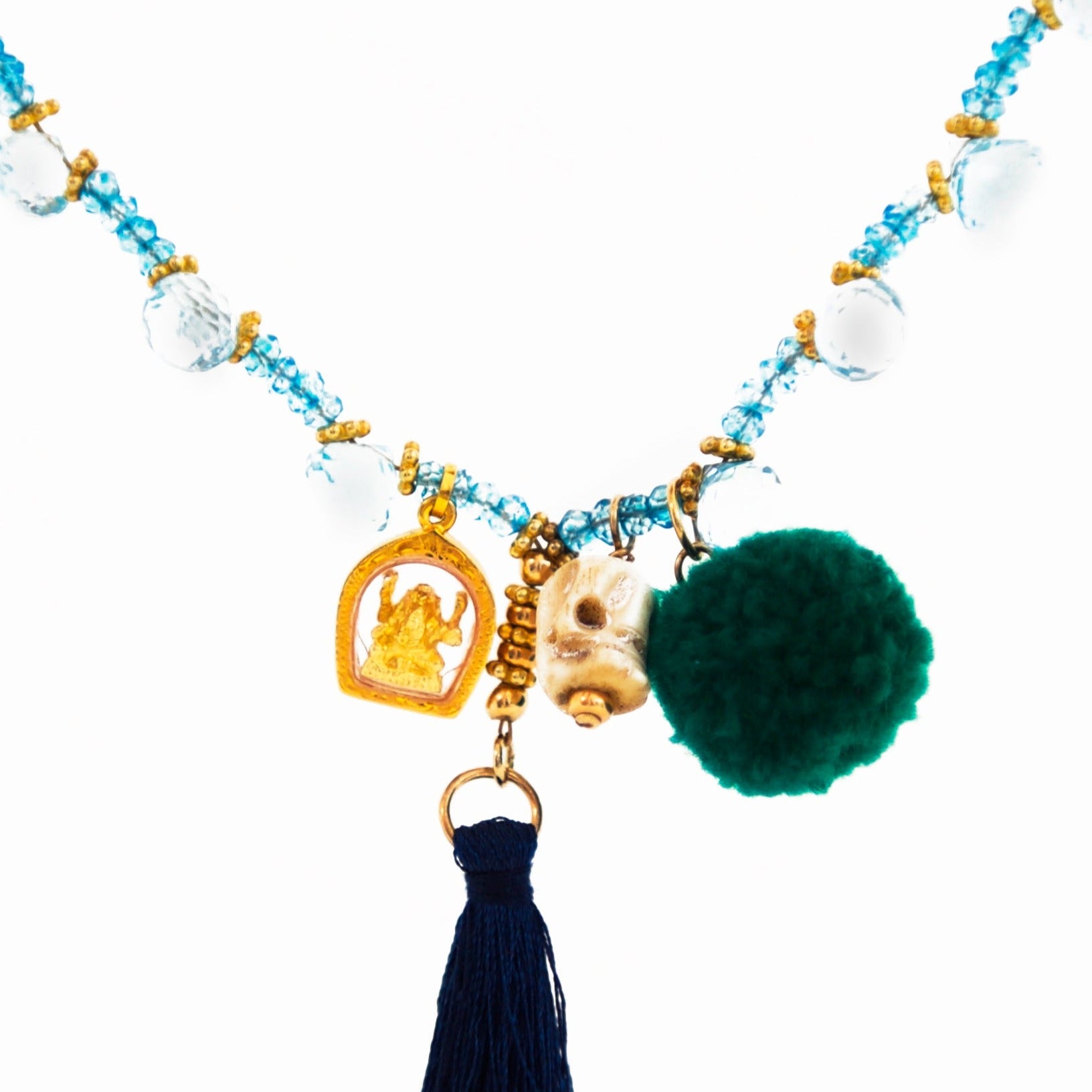 Charms: gold sacred Ganesha amulet, bone skull, reef green pompom and a dark blue tassel.
