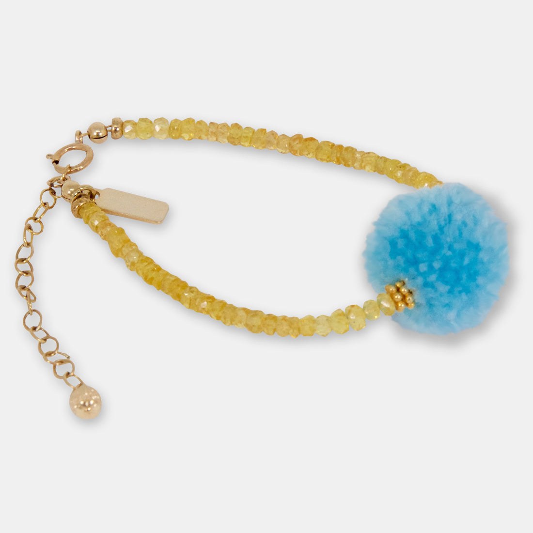 Delicate centre pompom bracelet made with precious yellow sapphire stones, gold-filled findings 16 cm approx. Plus glitter-ball extension chain 6cm approx.