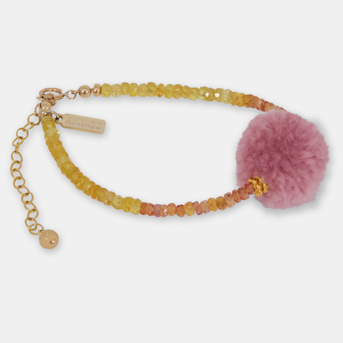 Delicate centre pompom bracelet made with precious yellow sapphire stones, gold-filled findings 16 cm approx. Plus glitter-ball extension chain 6cm approx.