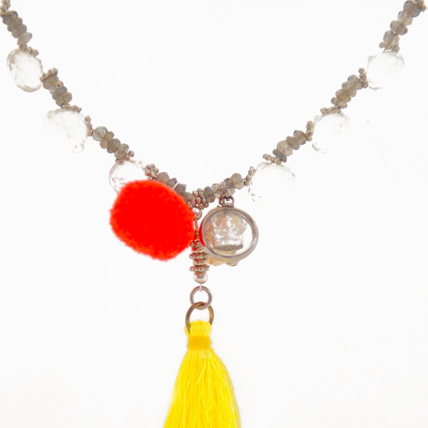 Charms: silver sacred buddha amulet, bone skull, magenta pompom and a deep purple tassel.