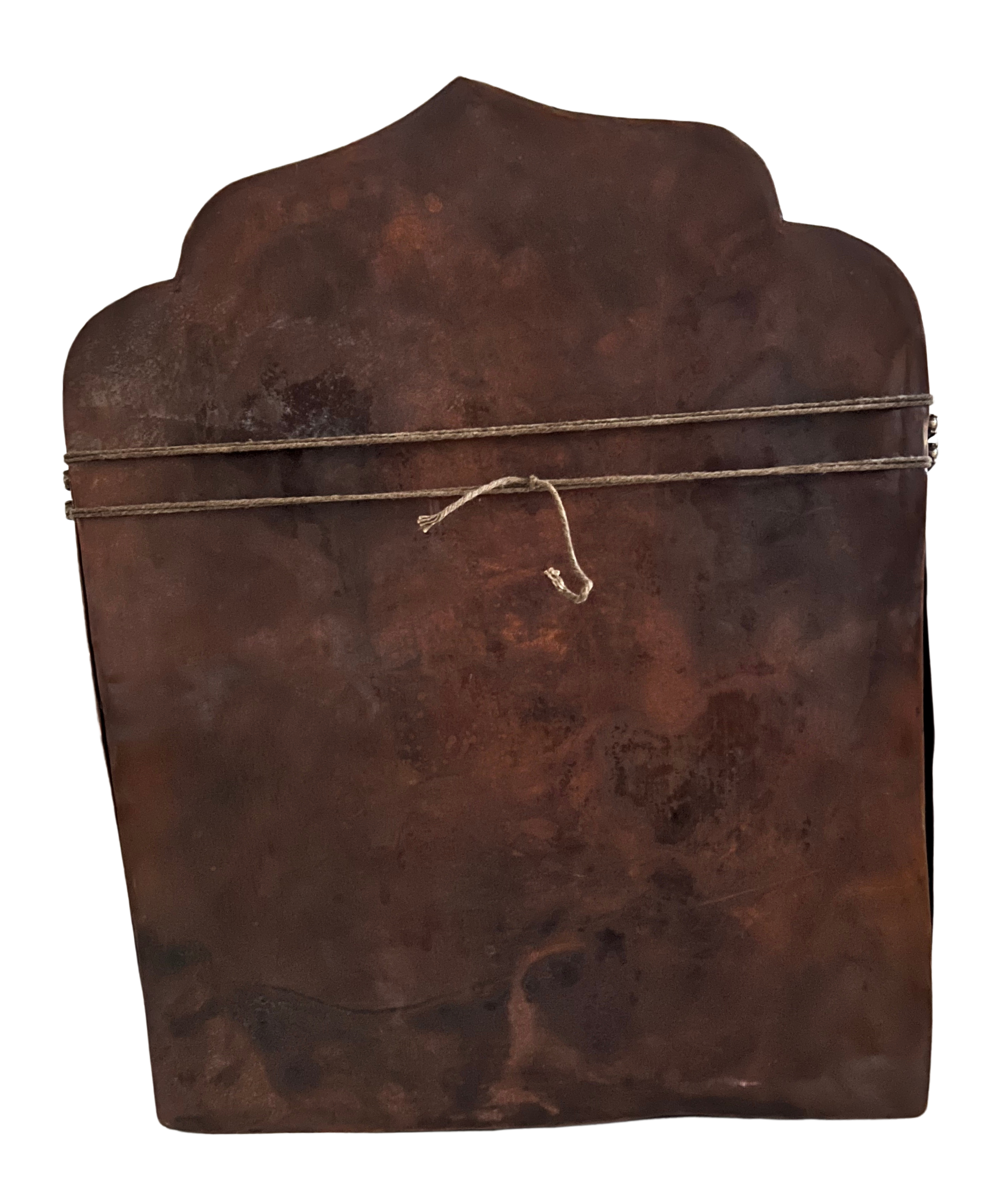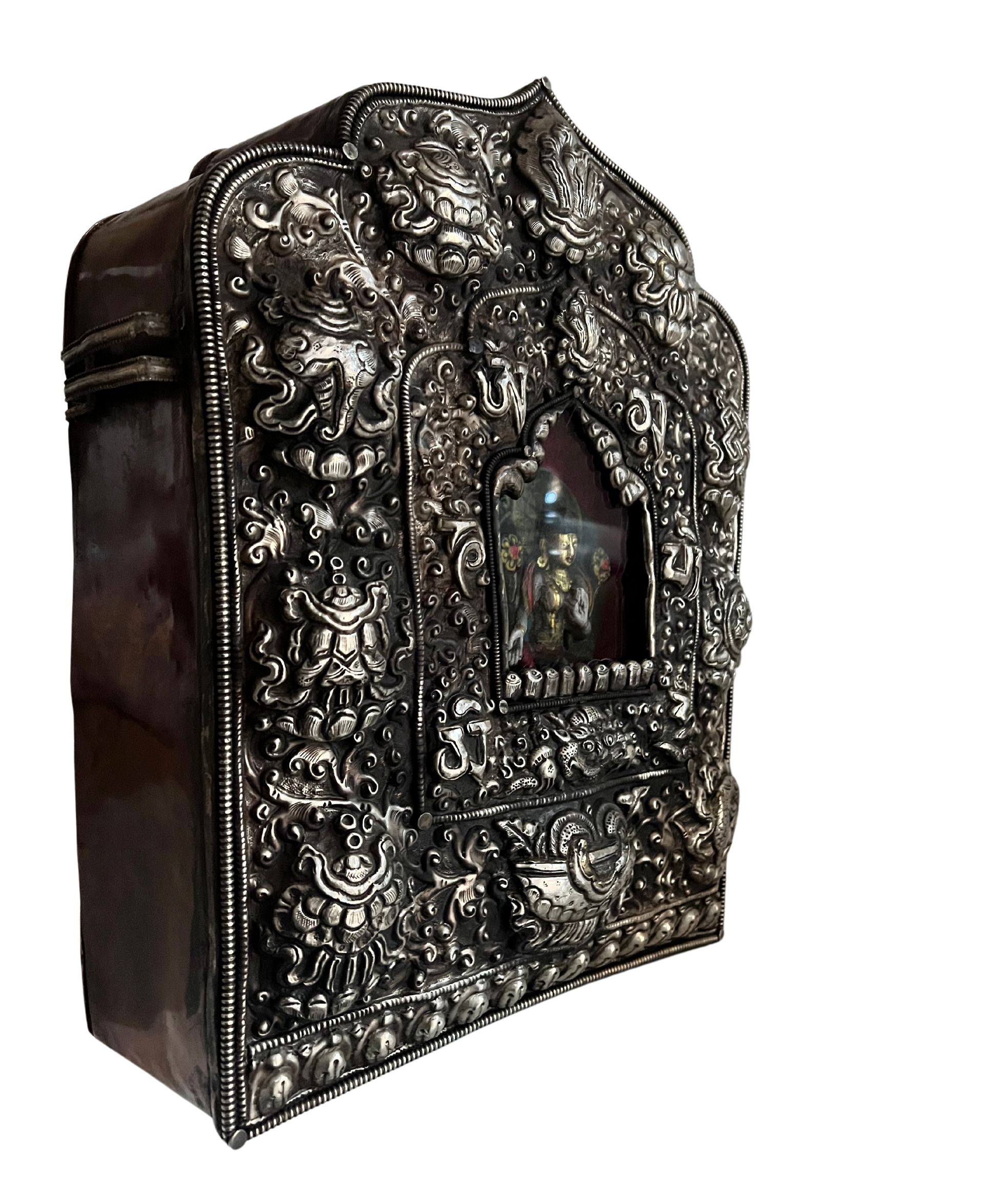 *A large antique Tibetan Buddha shrine or prayer box (also known as Gau) which encases a painted terracotta Buddha figure, (all wrapped in a hand embroidered quilted silk brocade). This was used as traveling shrine and carried on one's person when away from home. Beginning with the “om” written on the left hand side of this traveling shrine, an itinerant Tibetan monk once traced his fingers clockwise over the embossed characters. As he did this, he recited "om ma ni padh mey hum," the universal Tibetan Buddhist prayer for the well-being of all sentient beings. Known as a Gau, this portable shrine was used for prayer during travels or pilgrimages to hold sacred objects that offered protective powers. The copper and Tibetan silver (an alloy of copper and small amounts of silver). Gau is further empowered by an image of a fearsome guardian figure and a representation of the victory banner, an ancient Indian symbol that celebrates enlightenment. This is a wonderful spiritual piece.