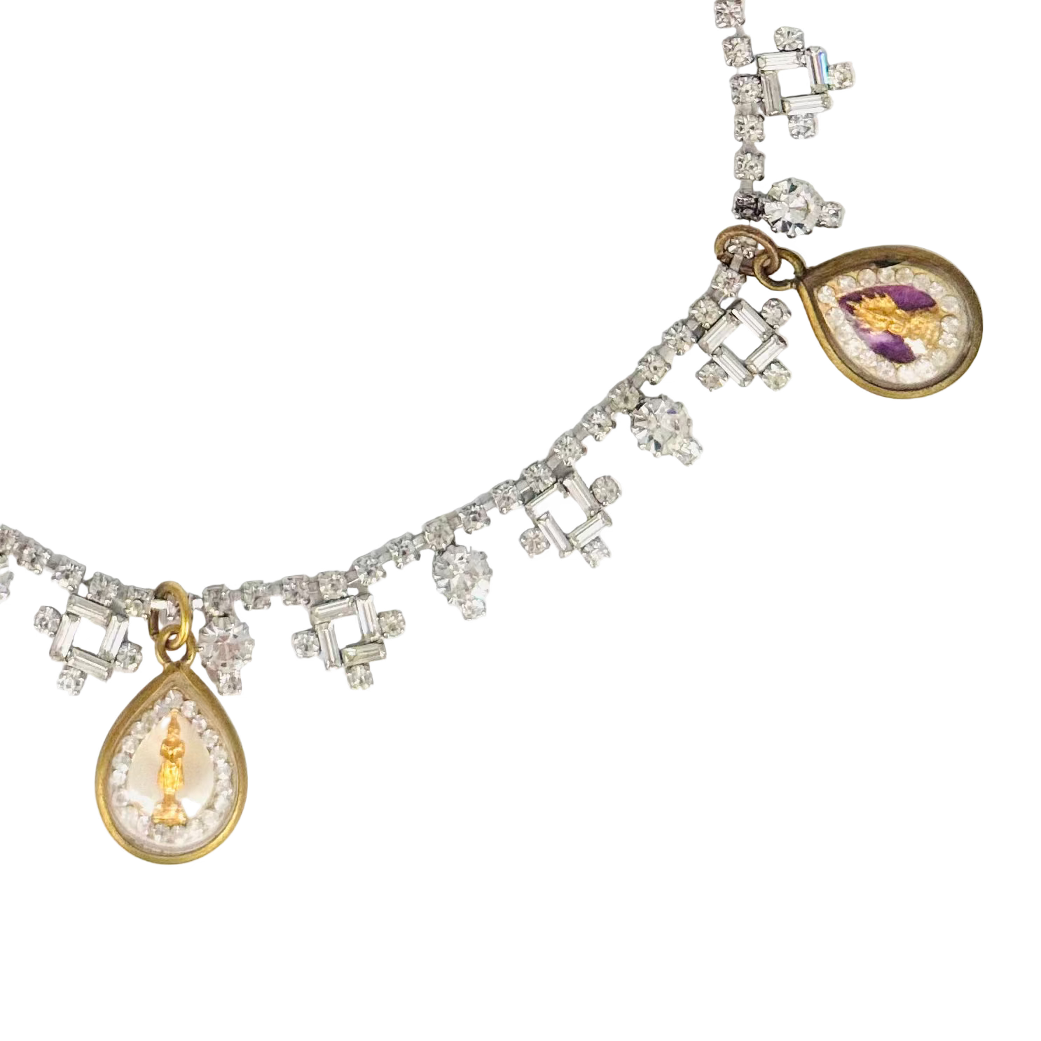 A 1950s vintage diamanté necklace featuring a subtle cross-shaped diamanté detail and five Buddha talismans with coloured backing in green, blue, red, purple, and gold. The Buddha represents qualities such as wisdom, compassion, and inner calm – a reminder to connect to your own centre, to move with clarity and compassion, and to feel supported and protected as you wear it.