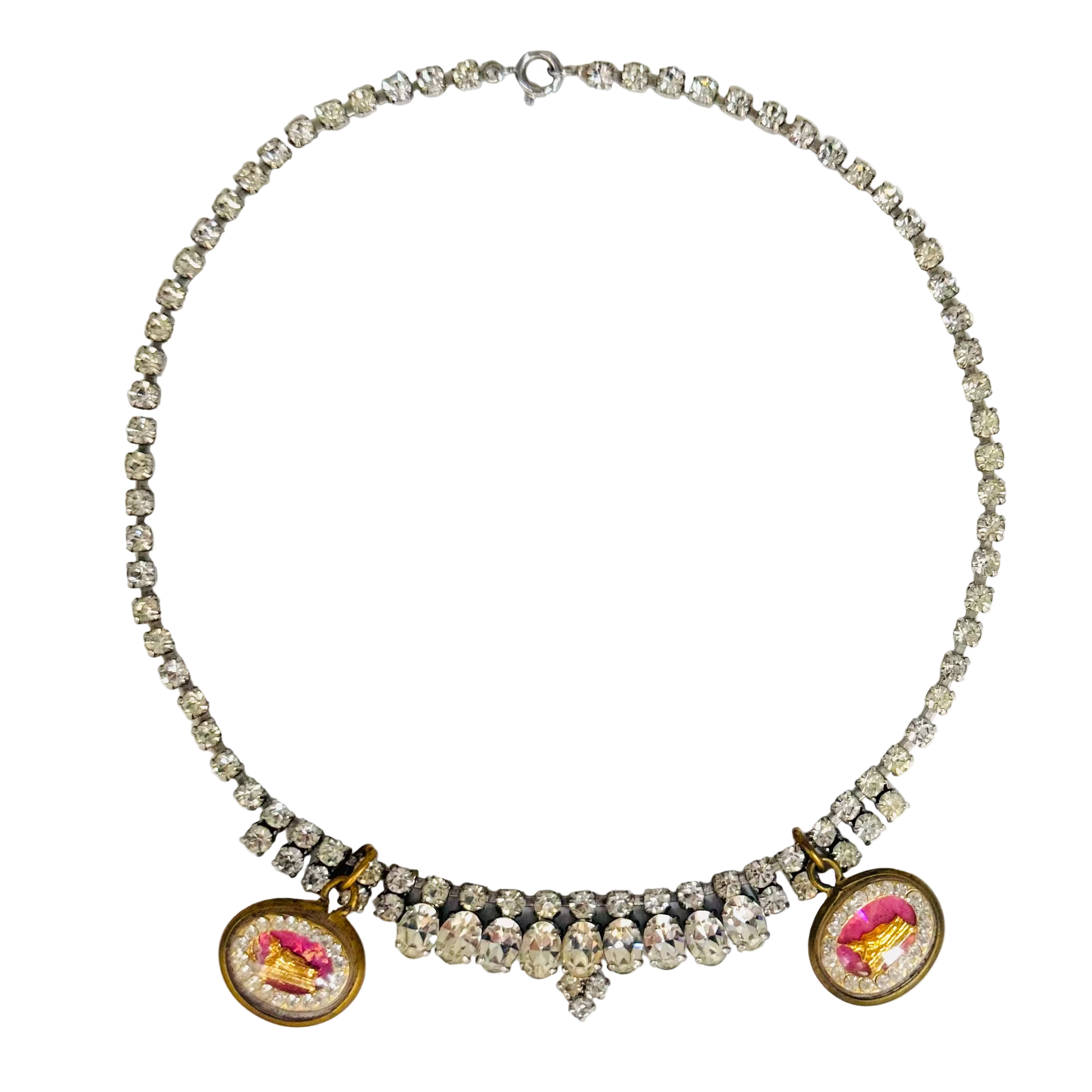 A 1950s vintage diamanté necklace featuring single-row diamantés and two reclining Buddha talismans with soft pink backgrounds. The reclining Buddha symbolises peace, acceptance, and deep inner calm - a reminder to let go, to move gently, and to feel supported and protected as you wear it.