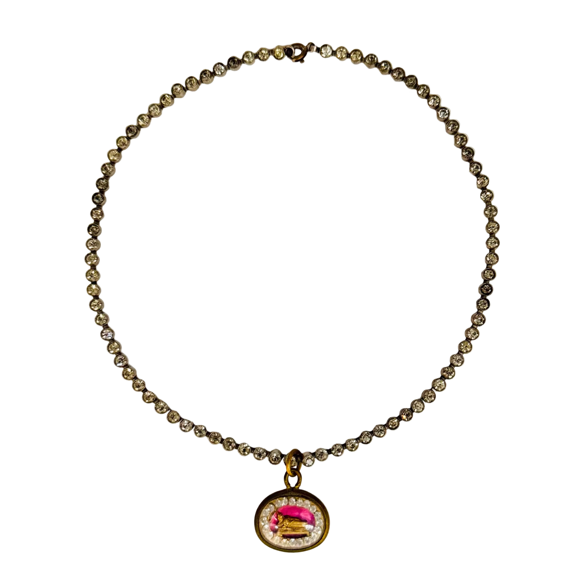 A vintage 1960s diamanté necklace/choker featuring small round-set stones and a reclining Buddha talisman with a soft pink background. The reclining Buddha symbolises peace, acceptance, and deep inner calm – a gentle reminder to let go, move softly, and feel supported as you wear it.