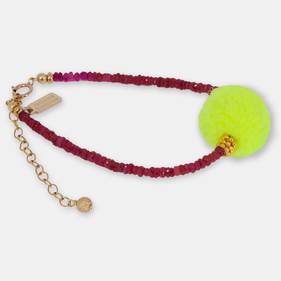 Delicate centre pompom bracelet made with precious ruby stones, gold-filled findings 16 cm approx. Plus glitter-ball extension chain 6cm approx.