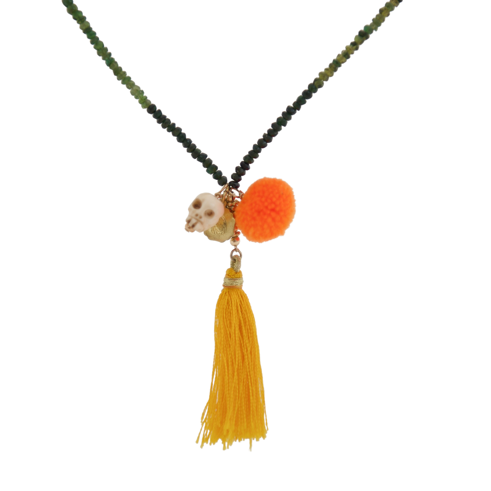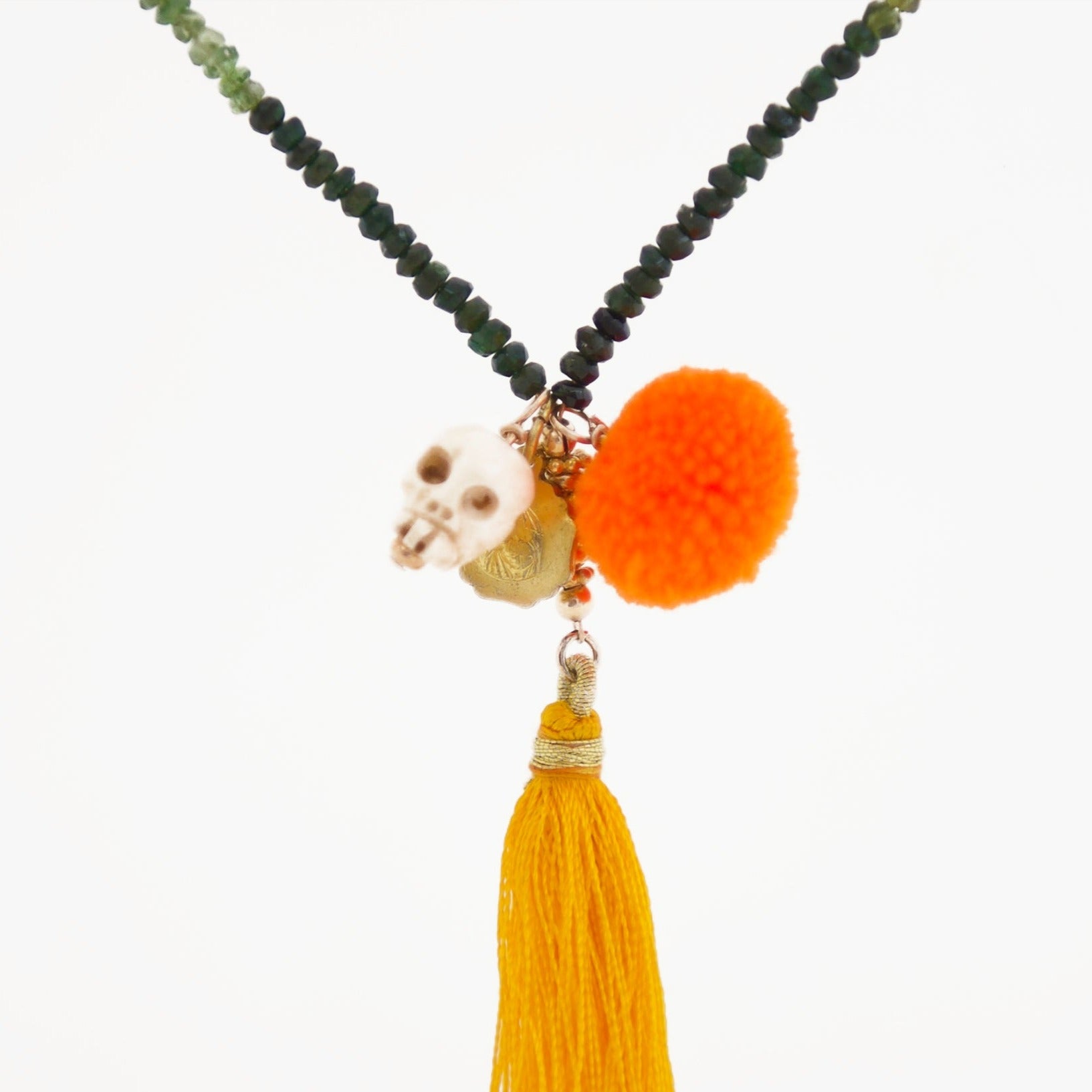 Charms: gold sacred Mary amulet, bone skull, neon orange pompom and a orange tassel.