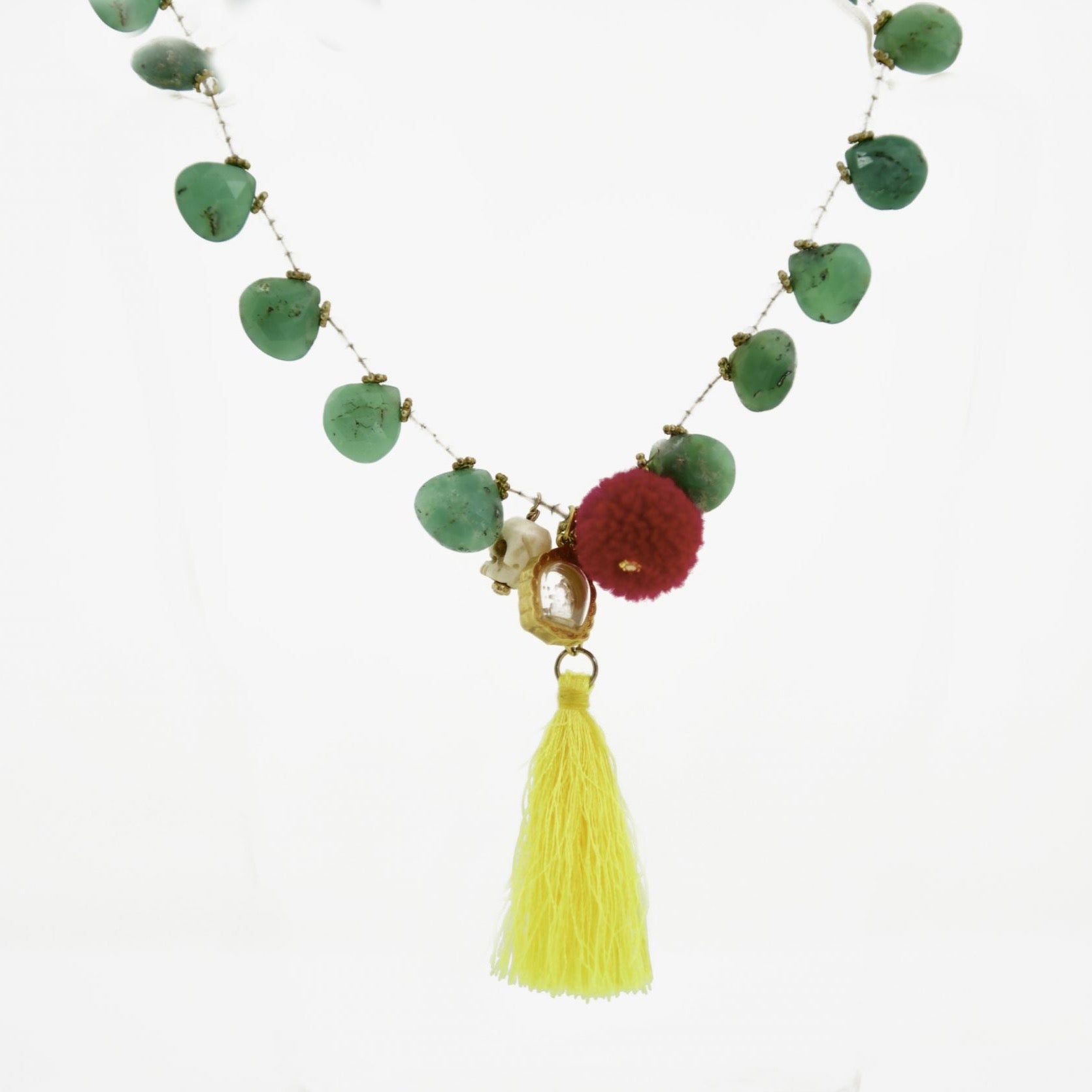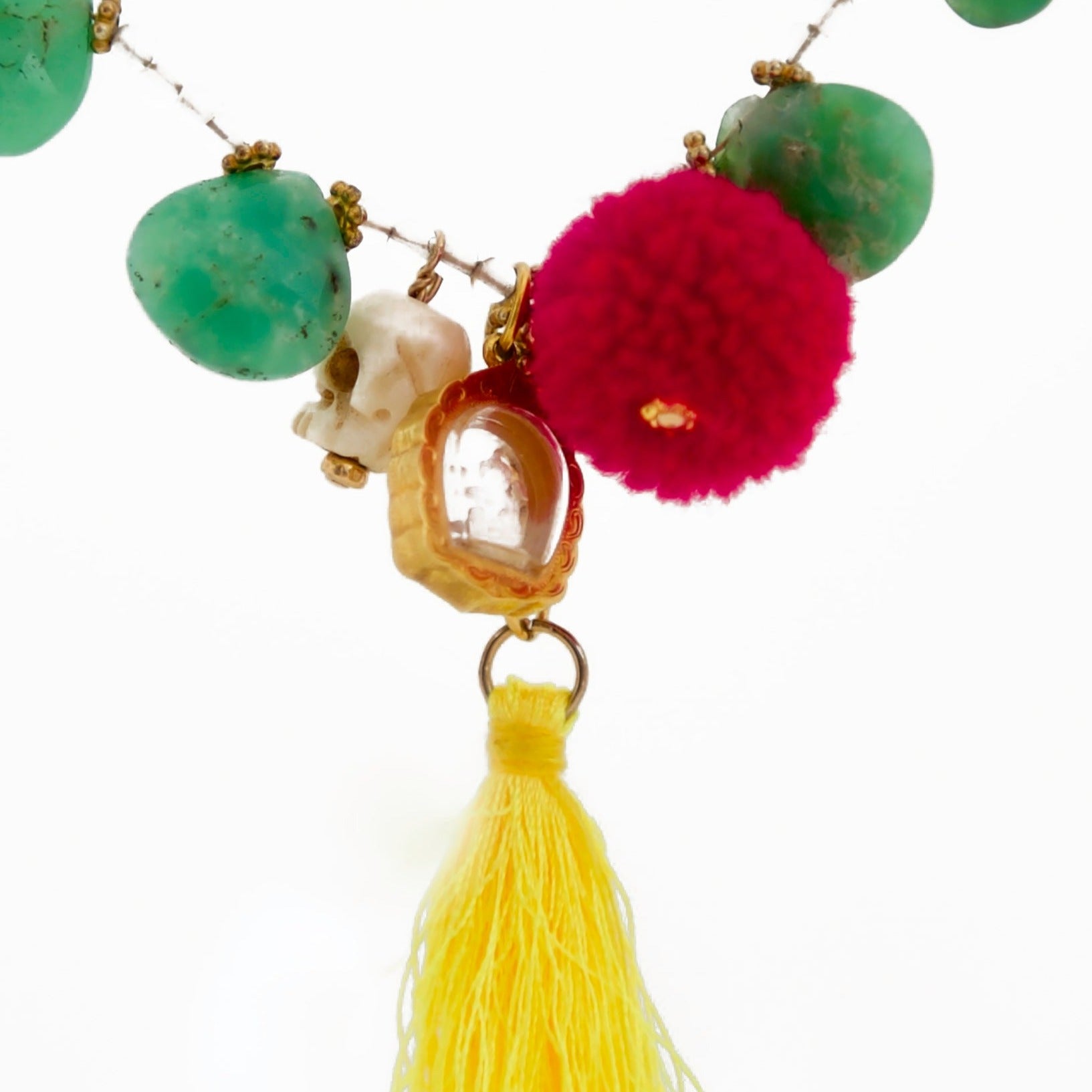 Charms: gold sacred Buddha amulet, bone skull, fuchsia pompom and a neon yellow tassel.