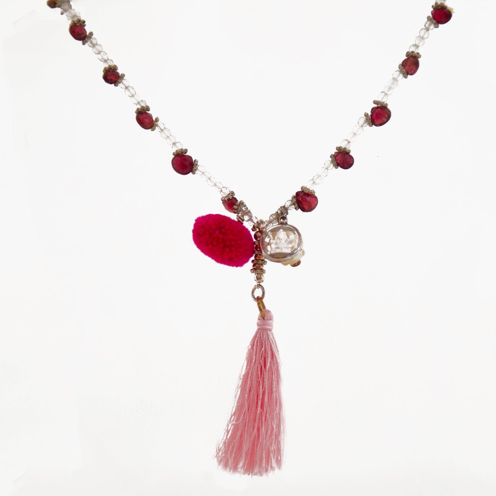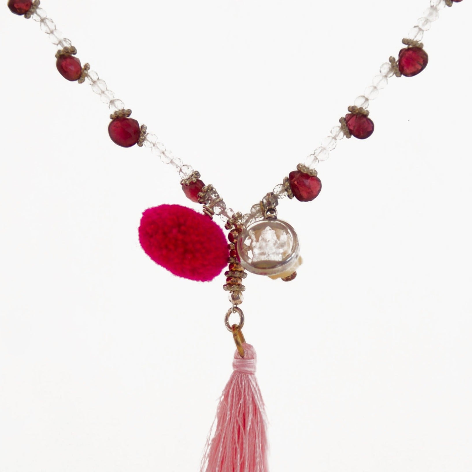Charms: silver sacred Ganesha amulet, bone skull, magenta pompom and a baby pink tassel.