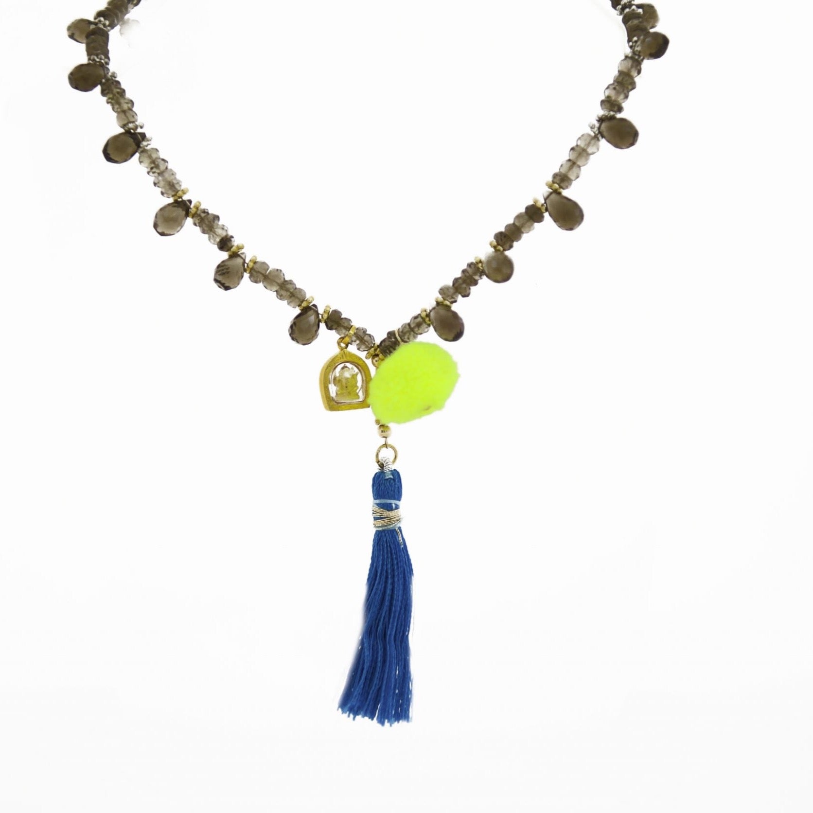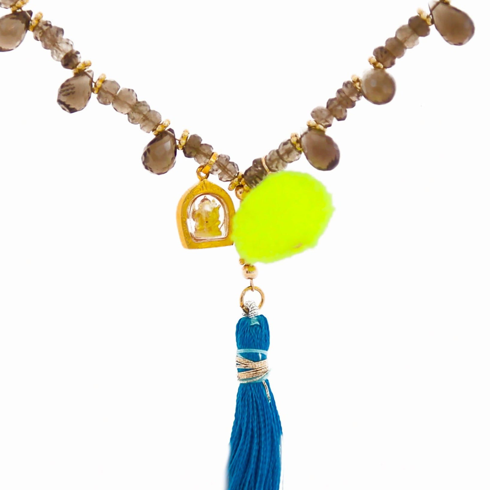 Charms: gold sacred Ganesha amulet, neon yellow pompom and a blue tassel.