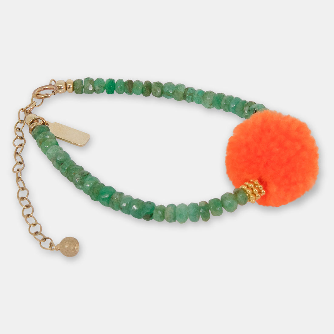 Delicate centre pompom bracelet made with precious emerald stones, gold-filled findings 16 cm approx. Plus glitter-ball extension chain 6cm approx.