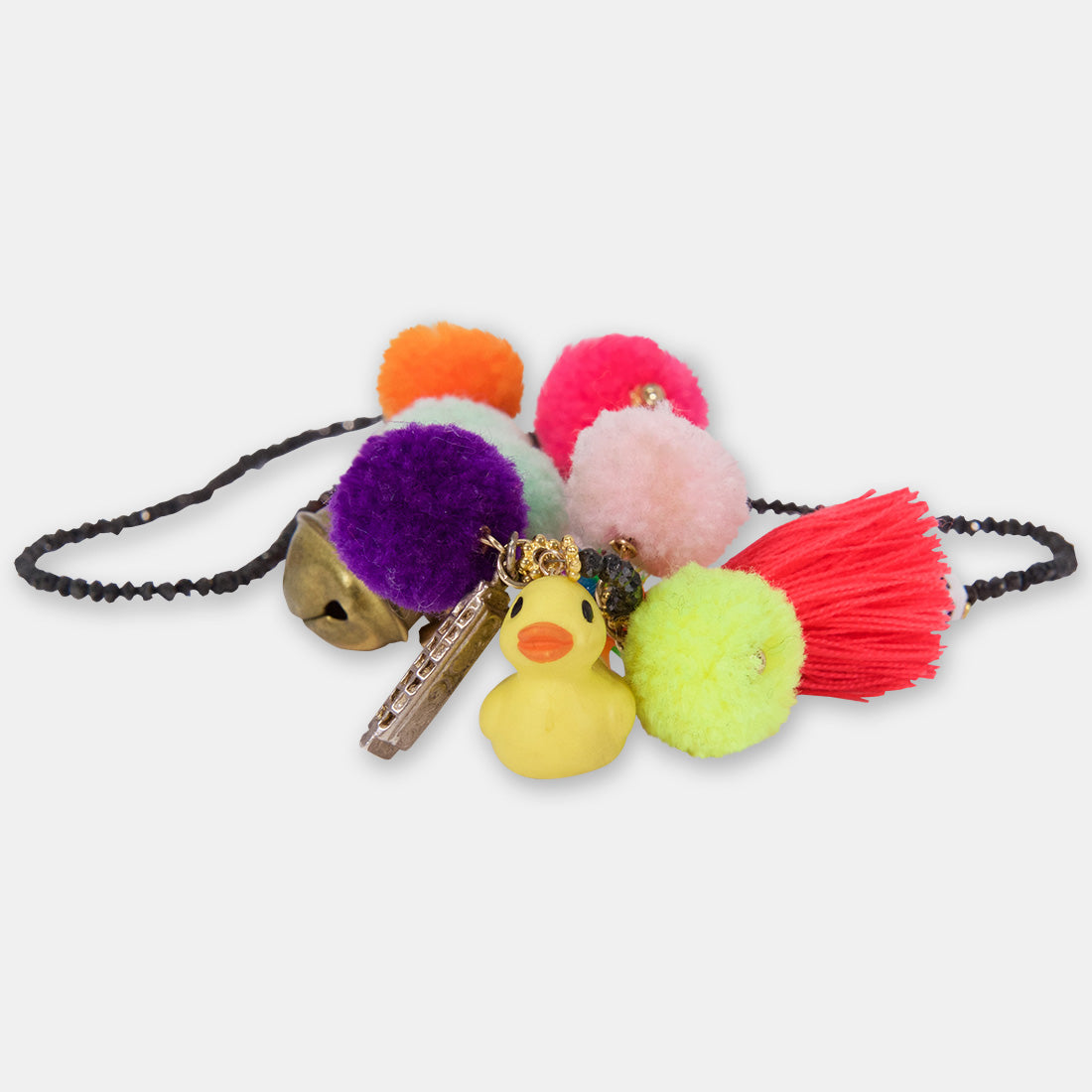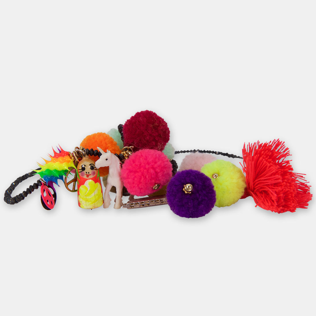 Charms: Pompoms in various colours, Word beads ‘love’, Bright Tassel, Rave Rainbow beads, Vintage Silver Harmonica charm, Rubber Duck charm, Brass bell charm, Miniature Unicorn charm, Miniature Russian doll charm, Pink bell charm, Gold-filled peace charm, Pink and black peace charms, Vintage gold Noah and the whale charm.