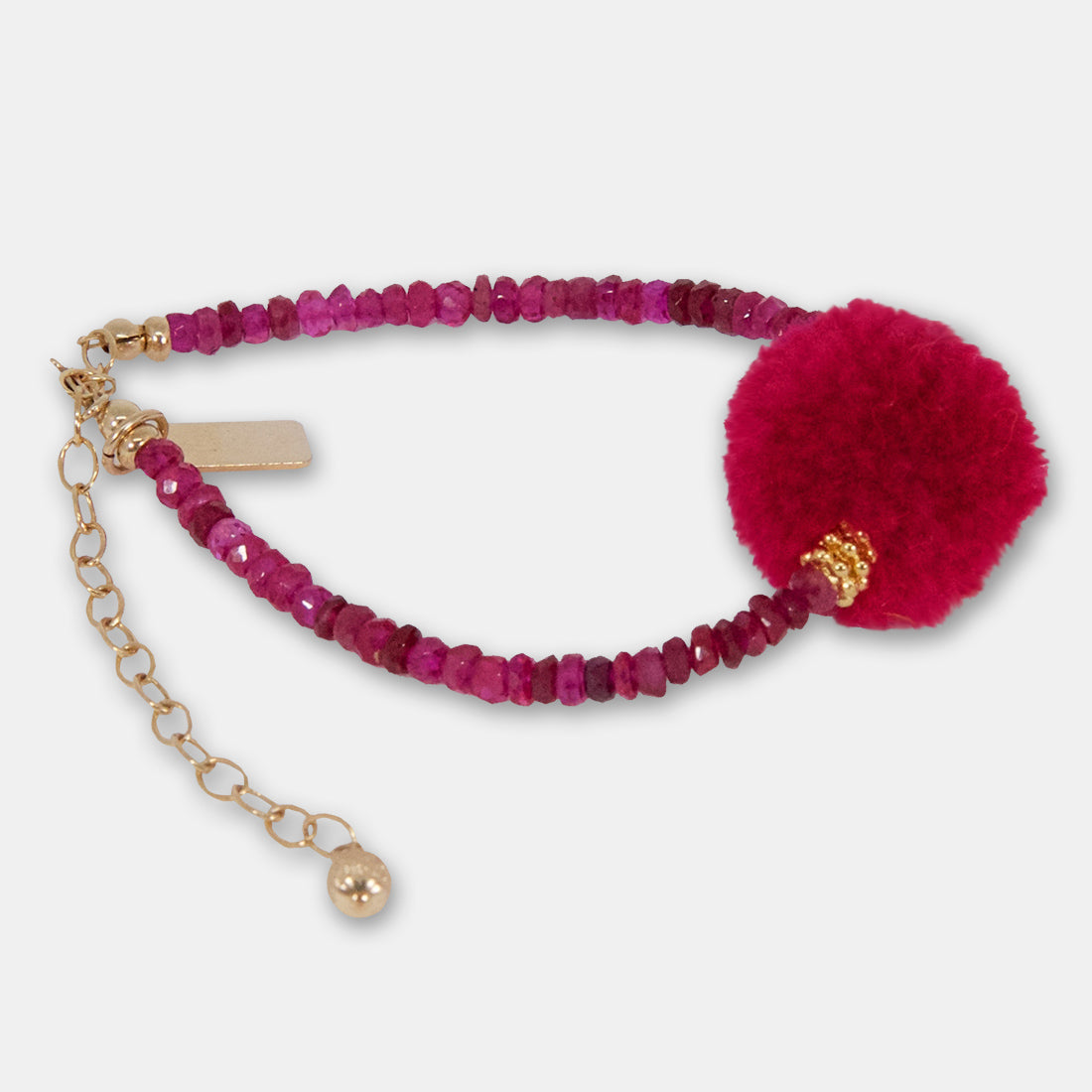 Delicate centre pompom bracelet made with precious ruby stones, gold-filled findings 16 cm approx. Plus glitter-ball extension chain 6cm approx.