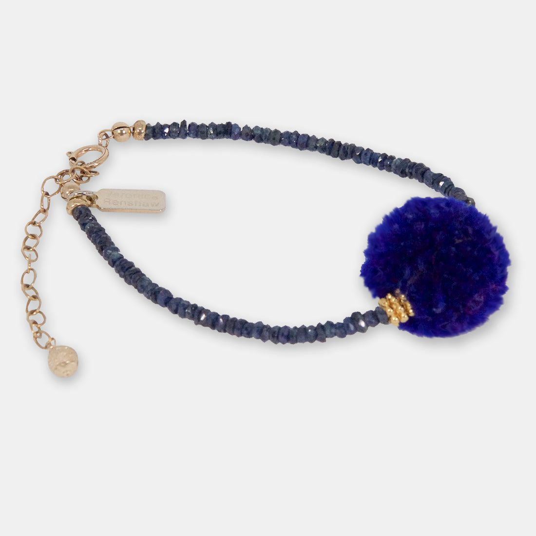 Delicate centre pompom bracelet made with precious blue sapphire stones, gold-filled findings 16 cm approx. Plus glitter-ball extension chain 6cm approx.