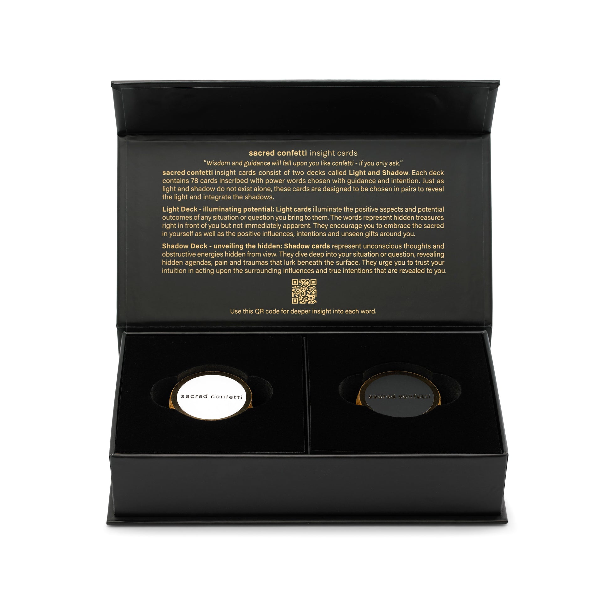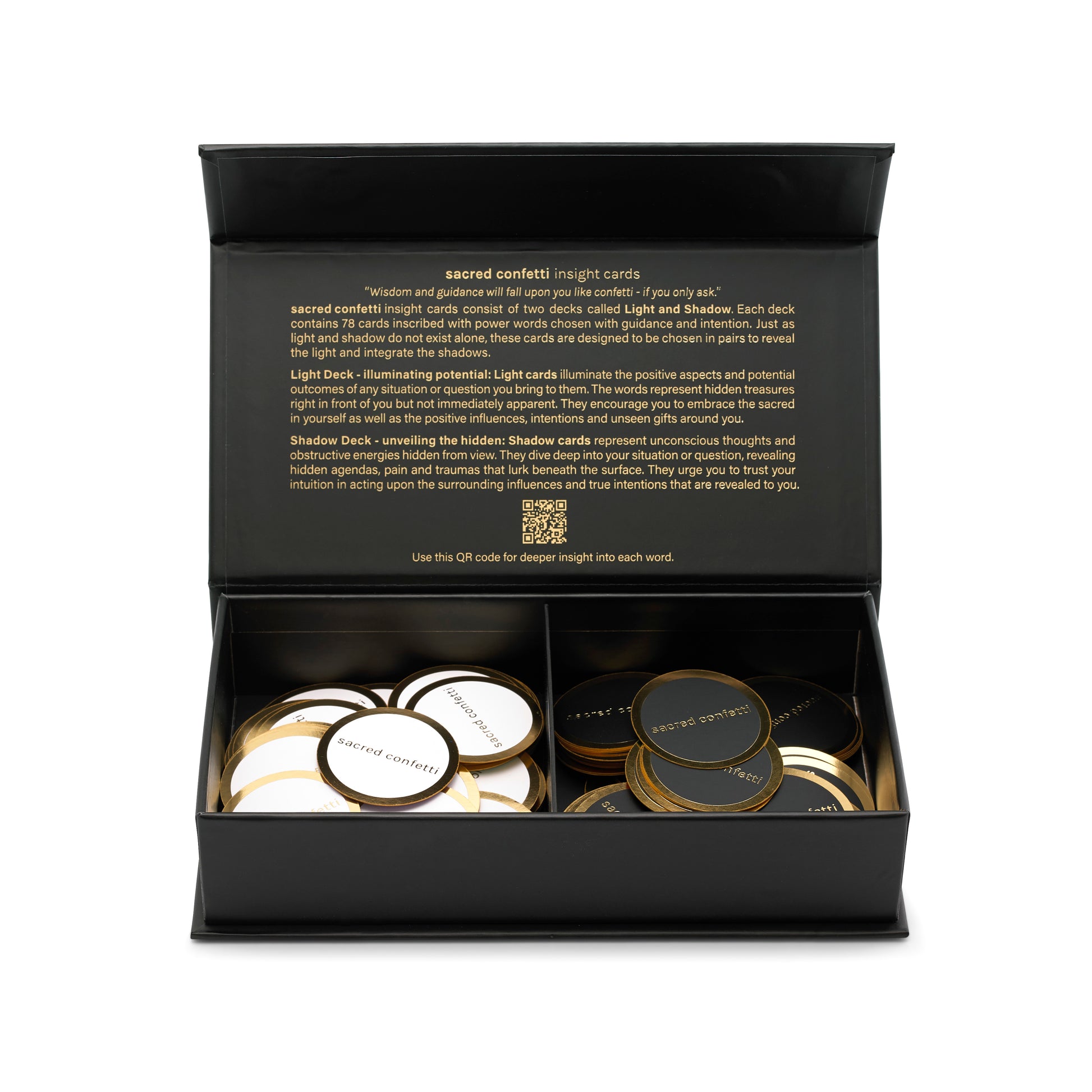 What are Sacred Confetti cards? You will find two colourful decks of insight cards named ‘Light’ and ‘Shadow’ inside each beautiful box. Light and Shadow when chosen in pairs, offer a deeper insight into any question or place you are at. They reveal the opposing forces of a situation, encouraging you to look from different perspectives as light and shadow, cannot exist without each other.