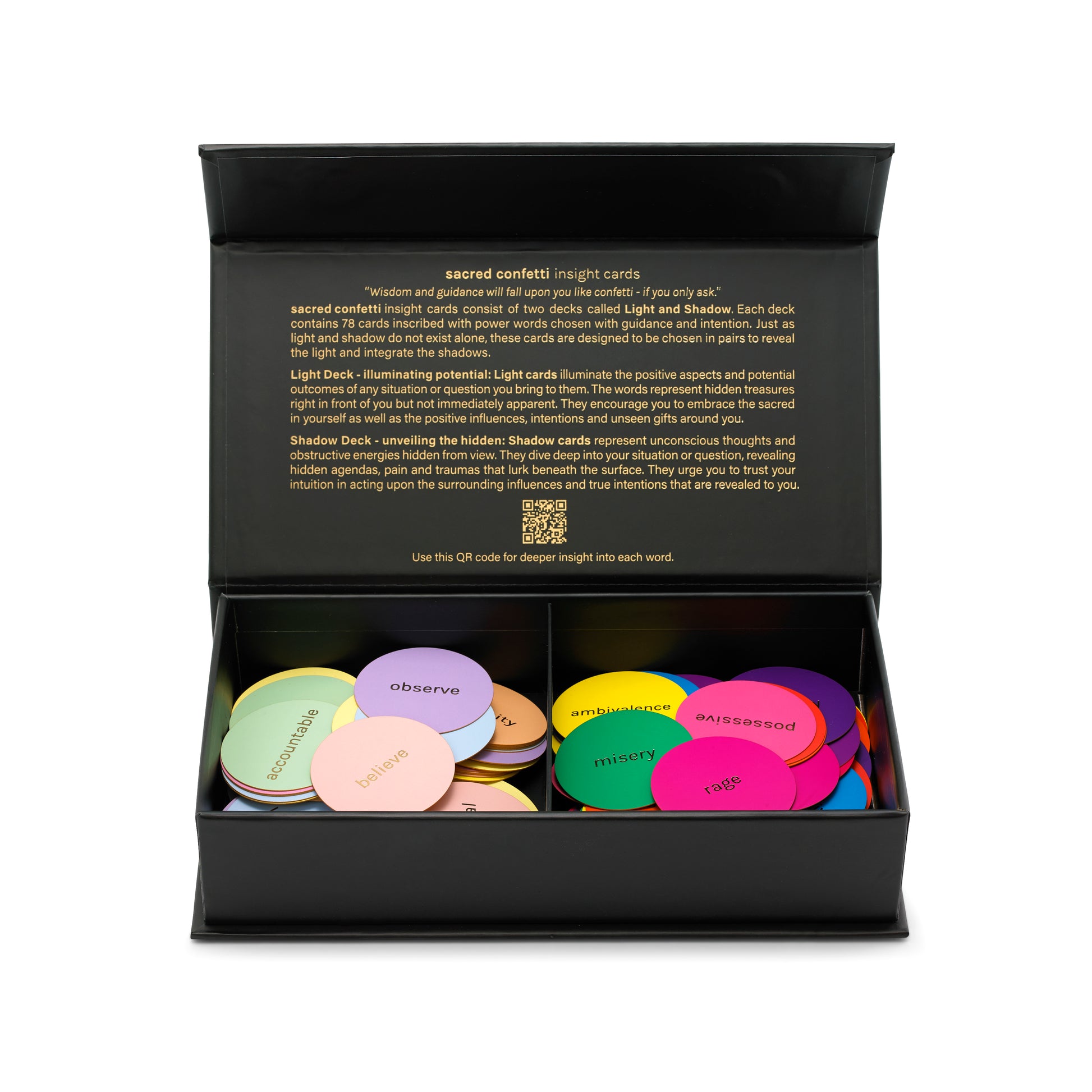 How can I use Sacred Confetti cards? You can choose to keep them privately or share them with family, friend and colleagues. Keep them in the box (remove the insert) or empty them out onto your chosen bowls for your kitchen table, desk or meditation space. They can be a daily dalliance into the deep waters of your subconscious mind, or your words-of-the-day for meditation, manifestation or for managing the murky waters of life.
