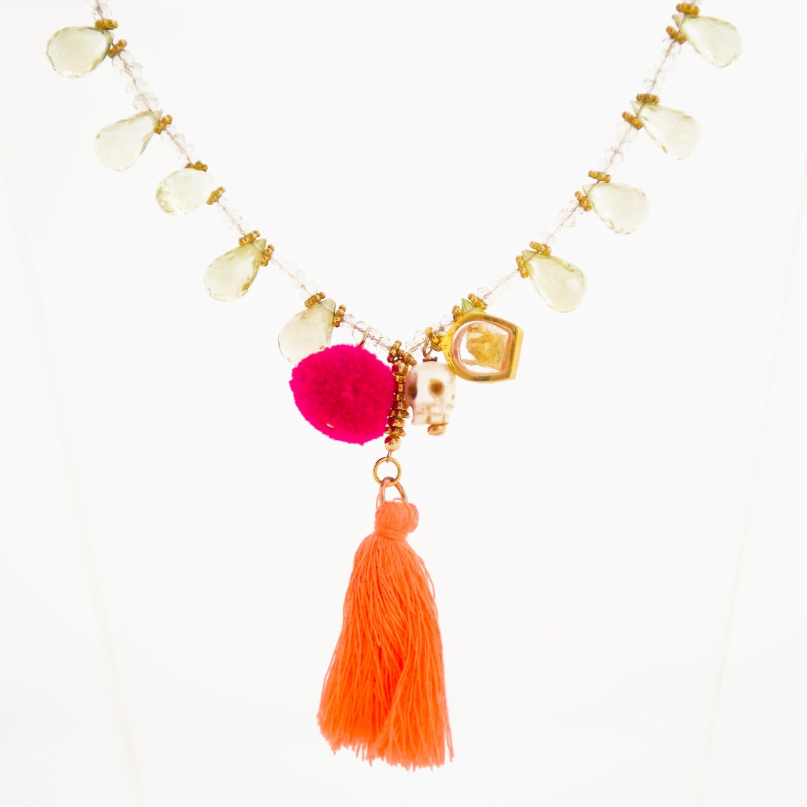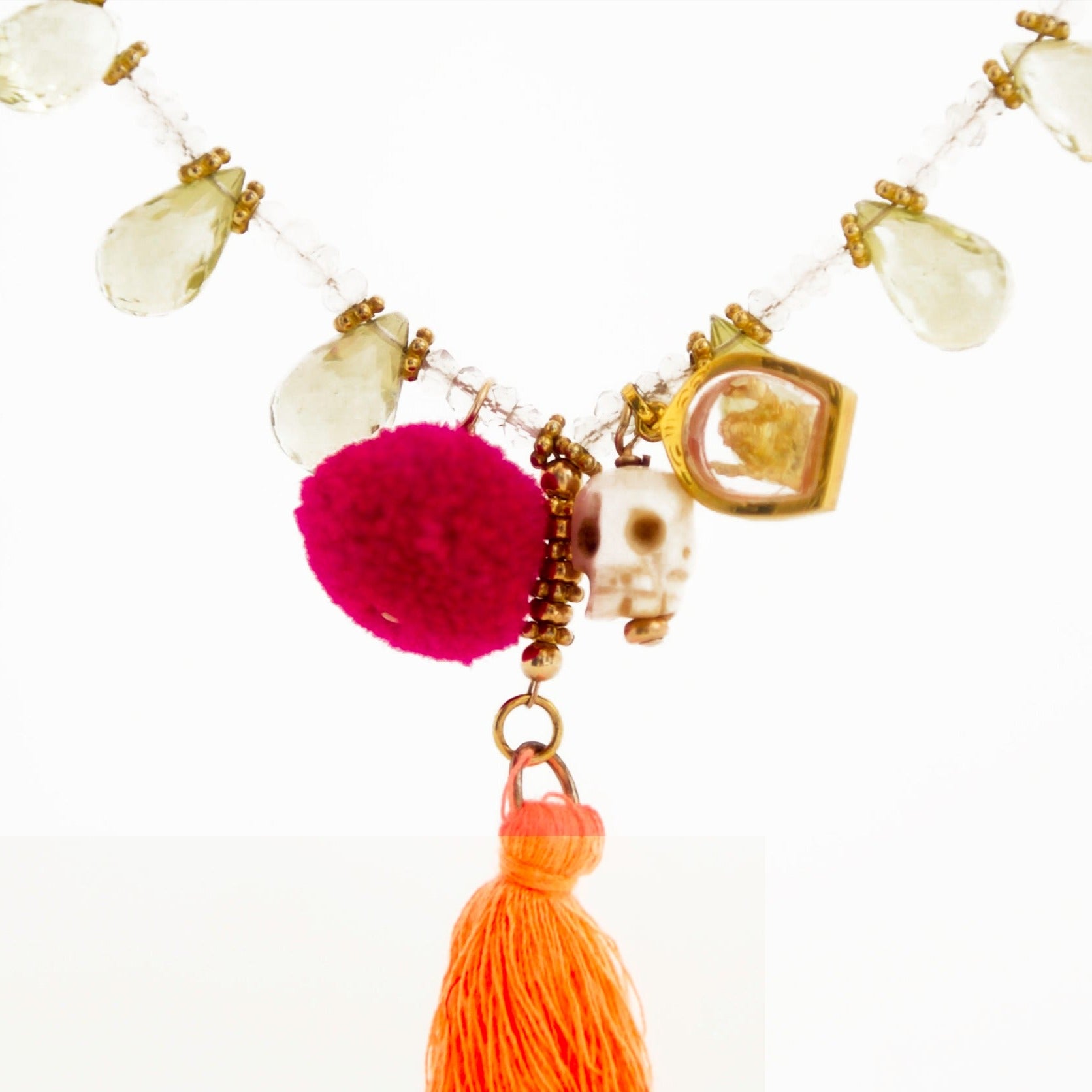 Charms: gold sacred Ganesha amulet, bone skull, magenta pompom and a neon orange tassel.