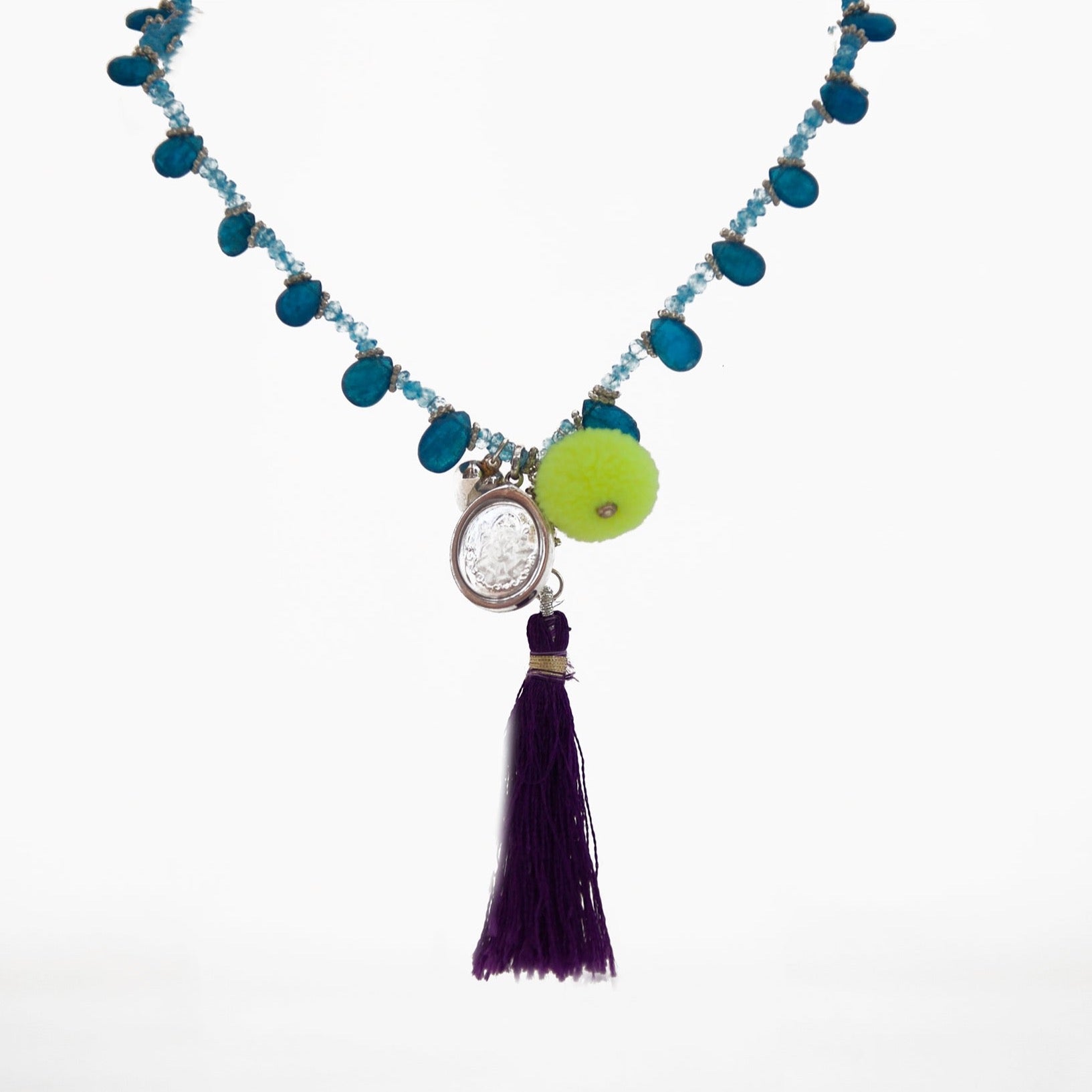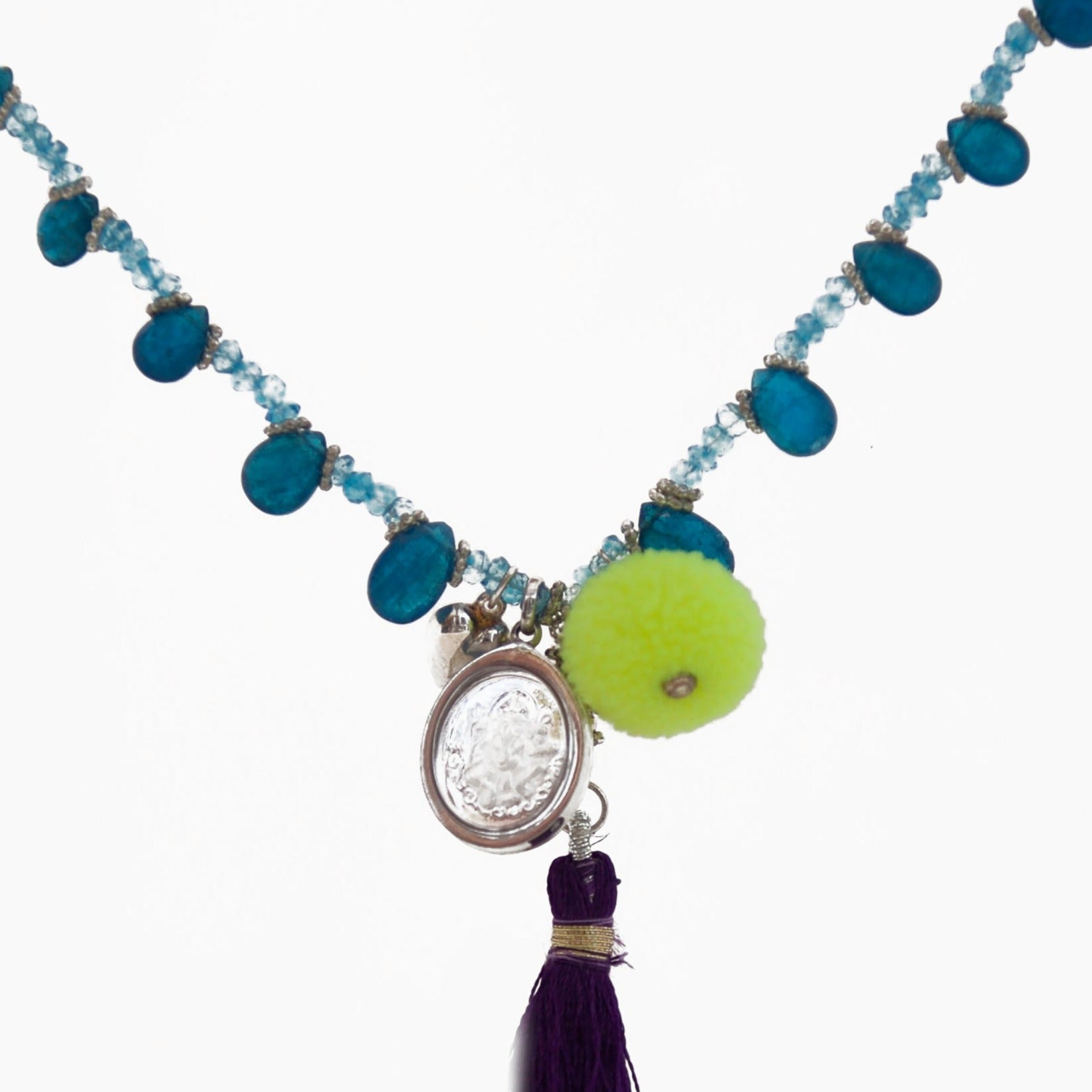 Charms: silver sacred Ganesha amulet, bone skull, neon yellow pompom and a deep purple tassel.