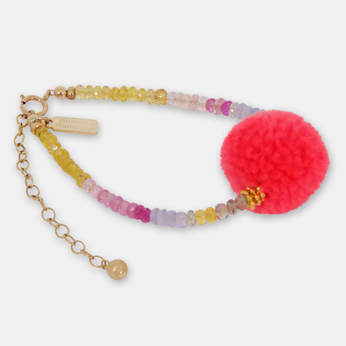 Delicate centre pompom bracelet made with precious multicoloured stones, gold-filled findings 16 cm approx. Plus glitter-ball extension chain 6cm approx.