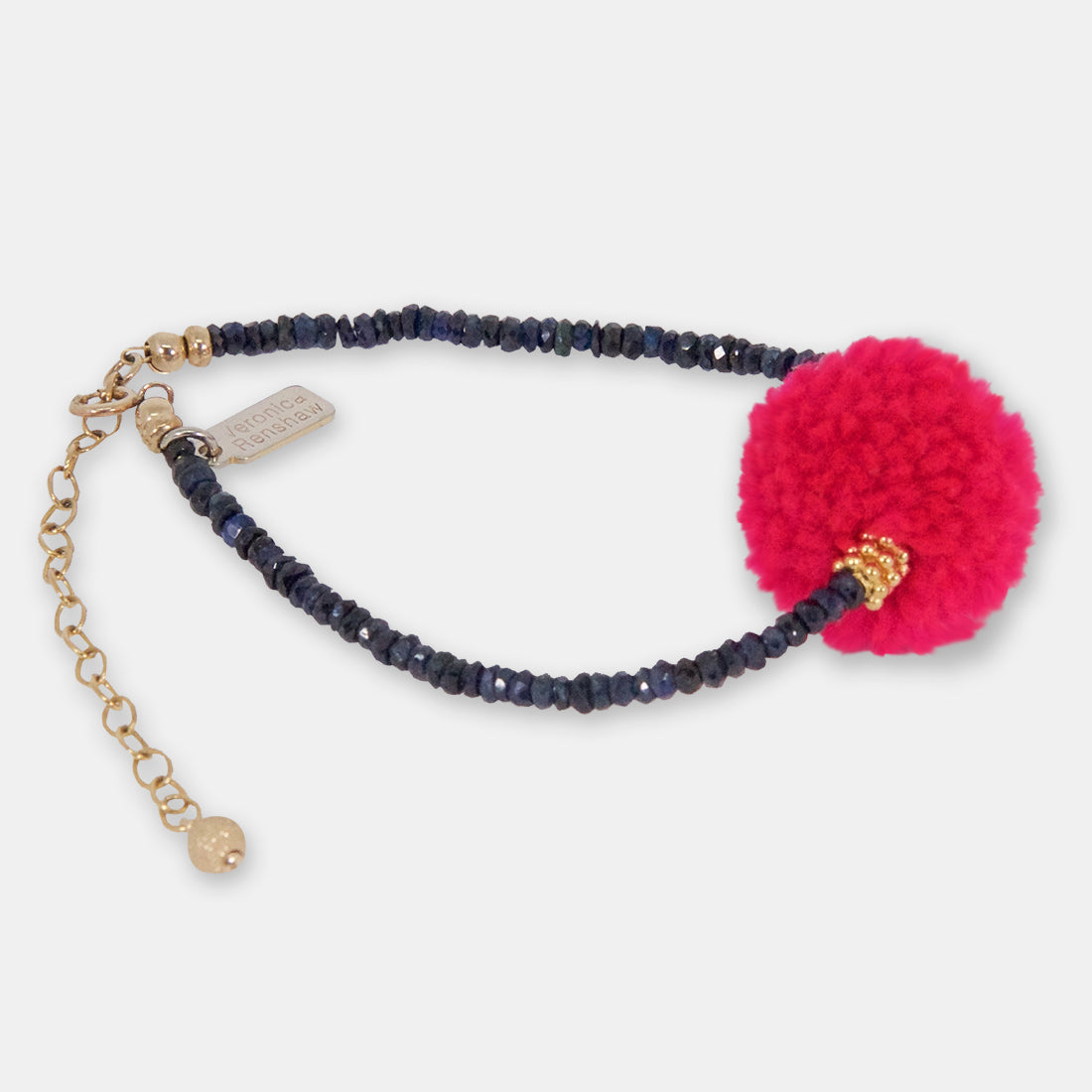 Delicate centre pompom bracelet made with precious blue sapphire stones, gold-filled findings 16 cm approx. Plus glitter-ball extension chain 6cm approx.