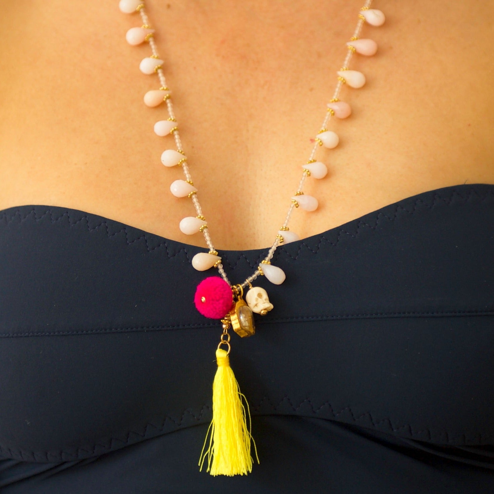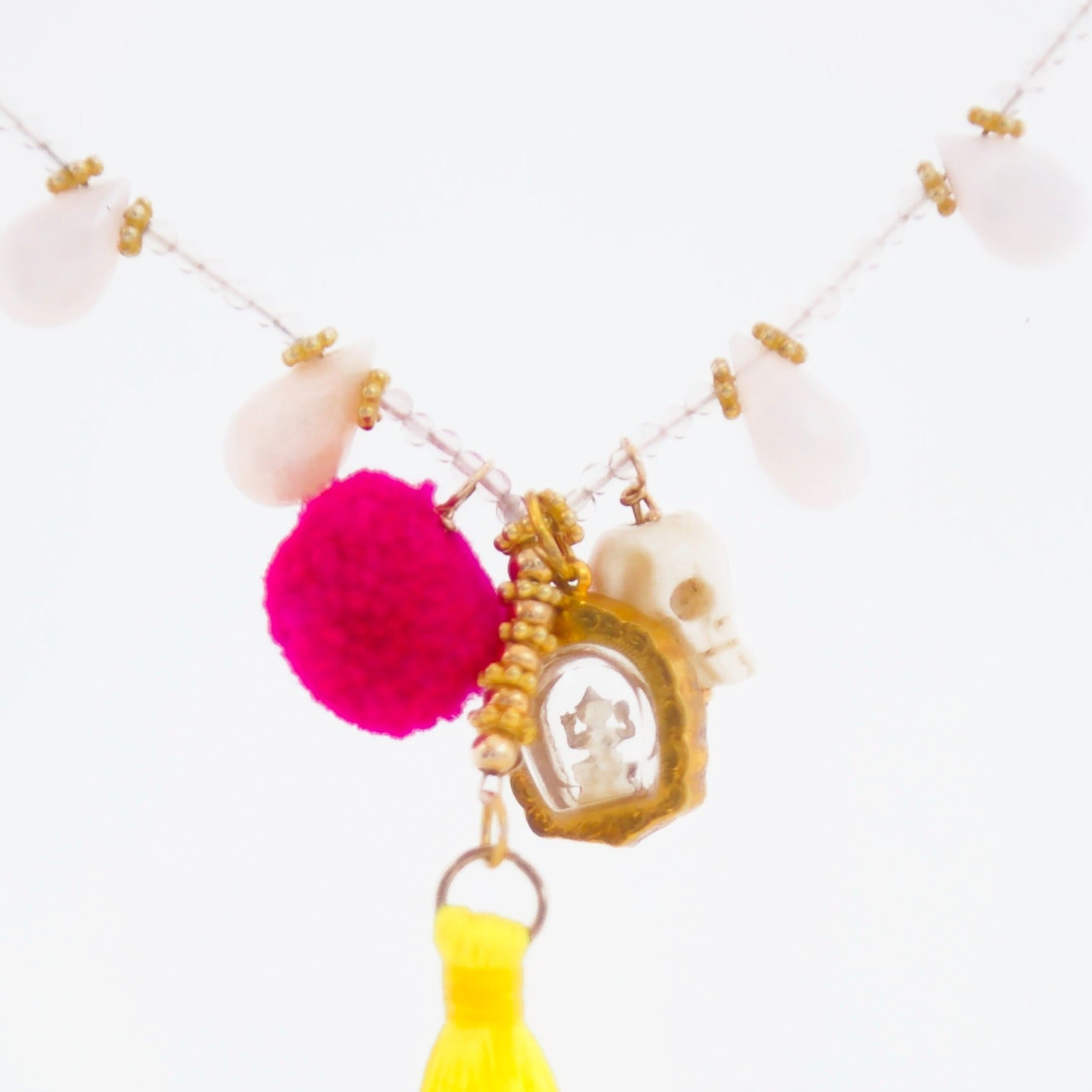 Charms: gold sacred Buddha amulet, bone skull, magenta pompom and a neon yellow tassel.