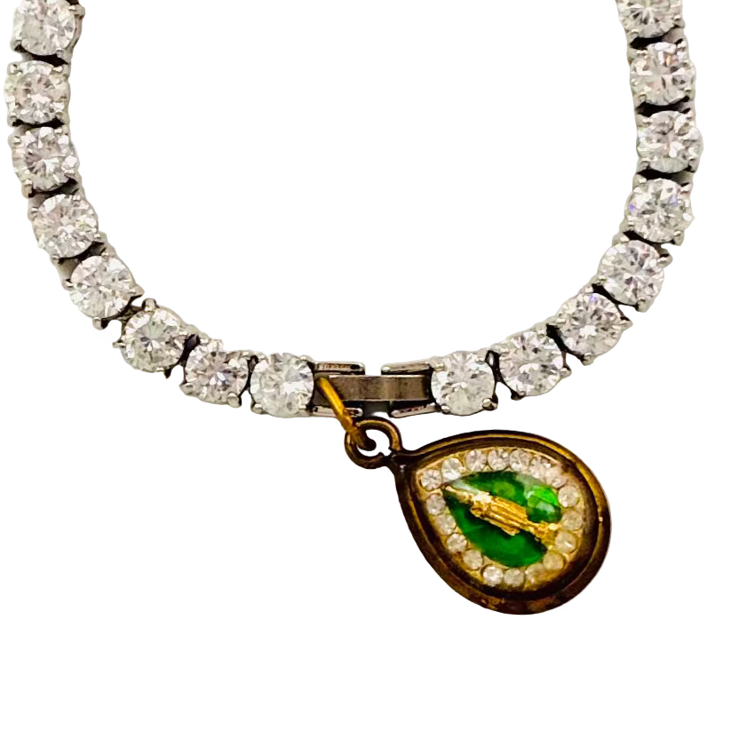 A vintage 1950s diamanté bracelet featuring rectangular stones and a Buddha talisman with a soft green backing. The Buddha represents qualities such as wisdom, compassion, and inner calm – a gentle reminder to stay centred and move with clarity and steadiness as you wear it.