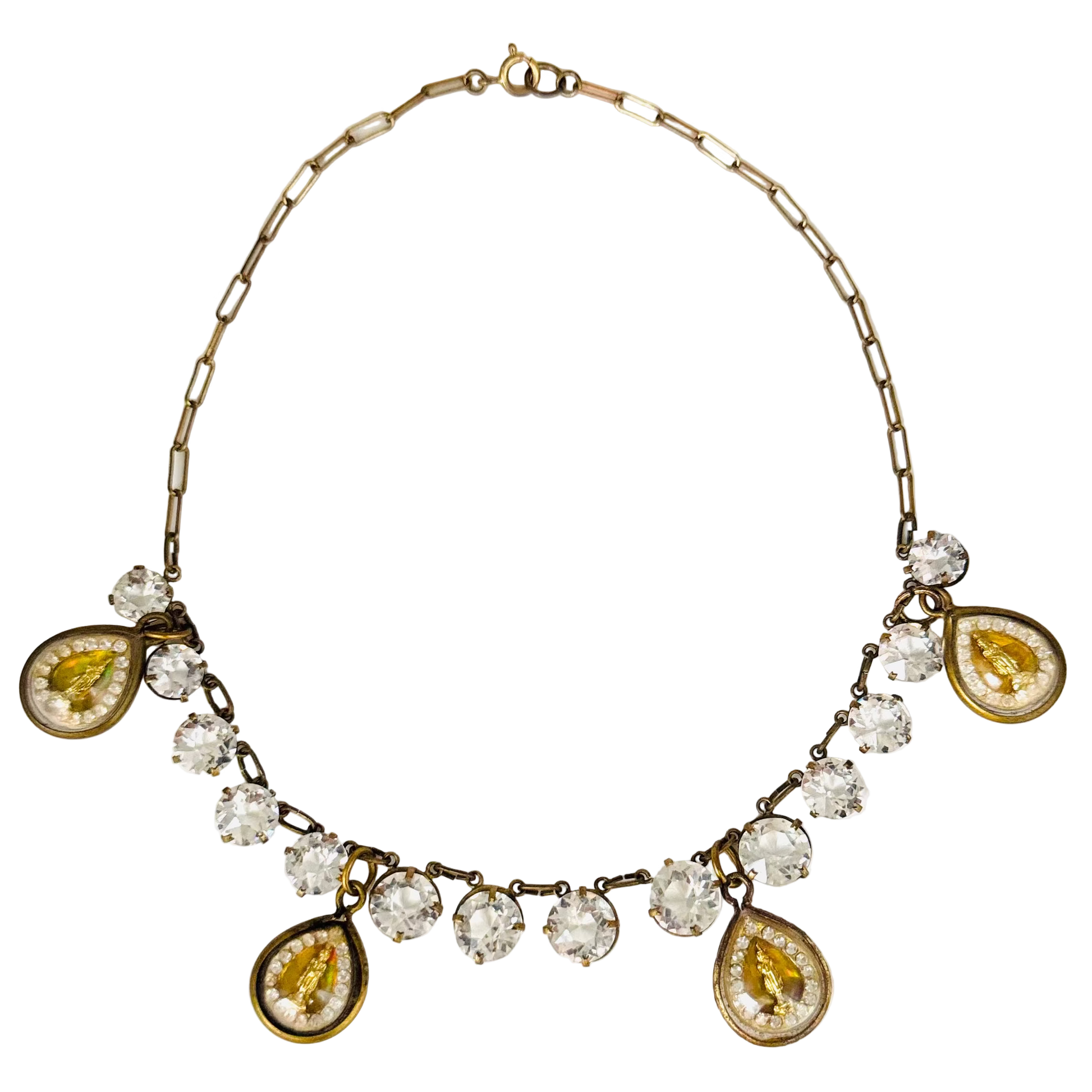 A 1950s vintage diamanté necklace featuring medium round stones and four Buddha talismans in soft yellow colouring, set in antique gold-tone metal with diamanté detail. The Buddha represents qualities such as wisdom, compassion, and inner calm – a reminder to connect to your own centre, to move with clarity and compassion, and to feel supported and protected as you wear it. The four Buddhas add a quiet sense of balance to this striking mid-century design.