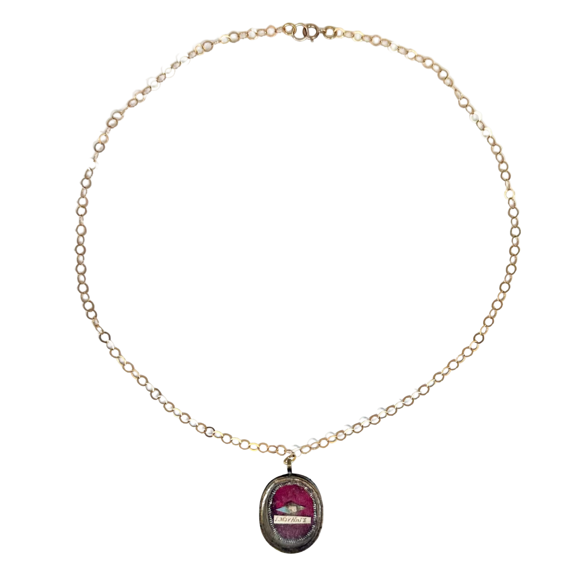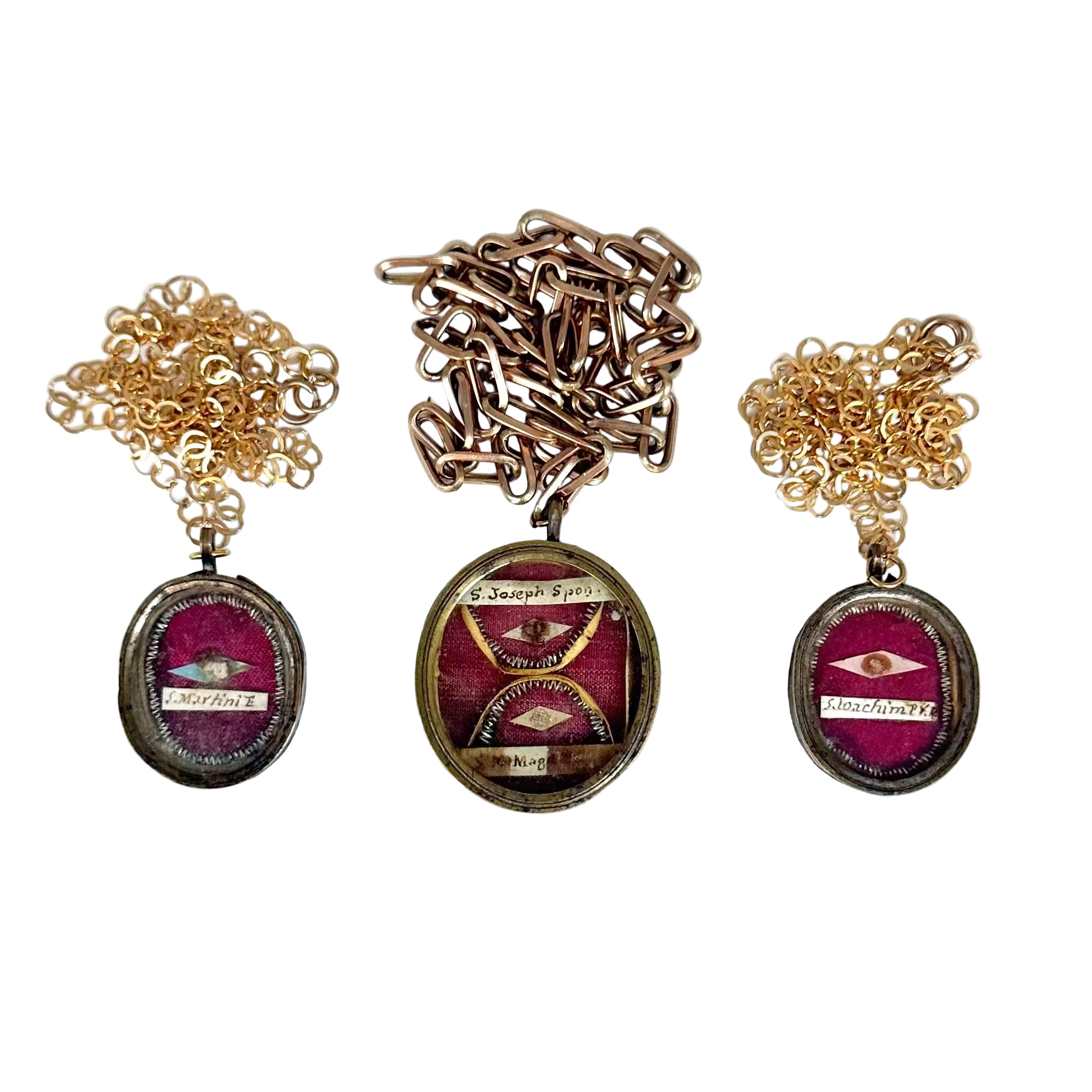 An antique Italian reliquary pendant containing a devotional relic of S. Martini E. (Saint Martin, Bishop). The relic rests on its original red silk ground, framed with gilt devotional paper beneath original glass.