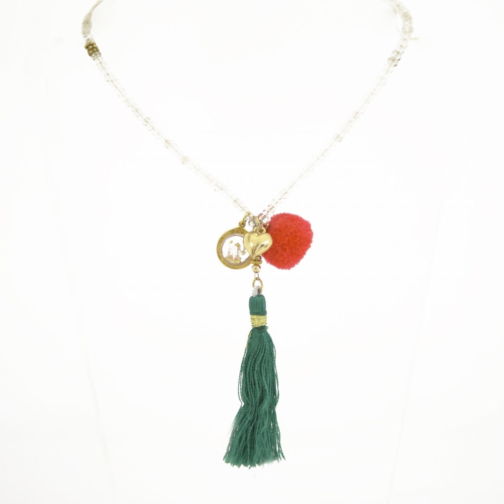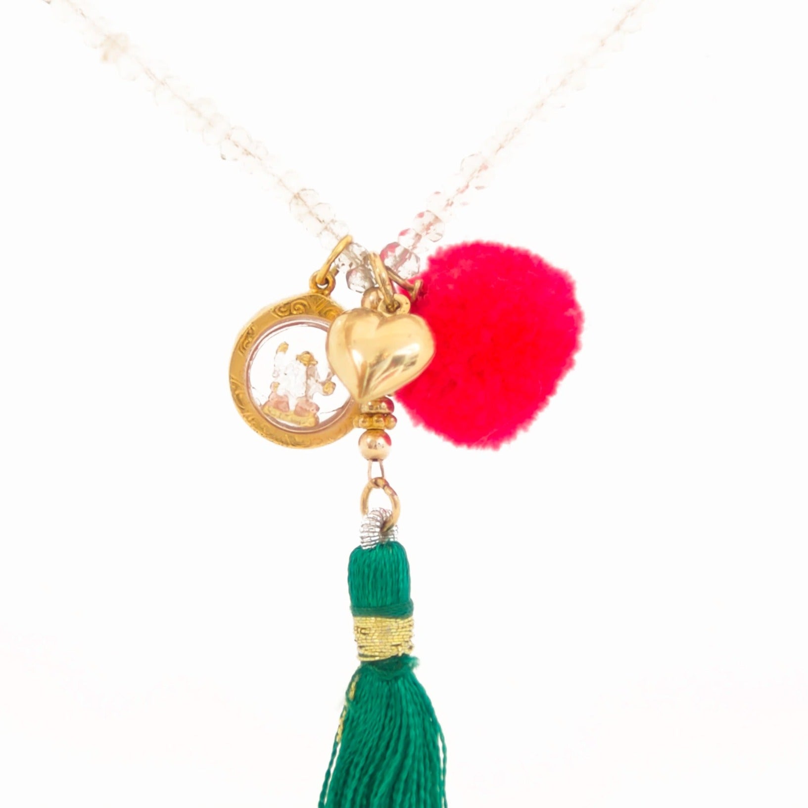 Charms: gold sacred Ganesha amulet, gold heart, pink pompom and a deep green tassel.